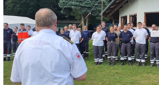 Er betonte dabei, dass das Engagement der einzelnen Helfer sehr groß und die Motivation sehr hoch ist. Die immer noch unübersichtliche Lage führt zu Verzögerungen oder Unklarheiten in den Aufgabenzuweisungen durch die verschiedenen Leitungsstrukturen. Das DRK hilft solange seine Hilfe gebraucht wird. Aufgabenfelder, die noch vor Monaten nicht im originären Portfolio der Aufgaben und Fähigkeiten des DRK zu finden waren, werden nun teilweise noch in der Erprobungsphase zum Einsatz gebracht. Hierzu gehört aktuell auch der Aufbau einer Kläranlage. Ebenso betonte er, dass das DRK bemüht ist, auch freiwillige Initiativen zu unterstützen oder fortzuführen. Nur eine Zusammenarbeit aller Kräfte, ob nun in den Hilfsorganisationen organisiert oder auf Privatinitiative, macht eine Bewältigung der Folgen dieser Katastrophe möglich. Und diese Folgen werden noch lange spürbar sein und eine Normalität ist erst in Wochen oder Monaten zu erwarten. Martin Bullermann bedankte sich bei allen Helferinnen und Helfern des DRK´s und bat auch darum, diesen Dank an alle, die schon im Einsatz waren oder noch sein werden, weiterzuleiten.“